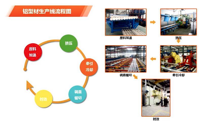鋁棒平鋪→鋁棒加熱→溫度達480℃保溫1h→模具加熱至480℃→模具放入模座→送至原料口→擠壓→牽引→矯直→時效→出爐→200℃后保溫2h→冷卻→完成